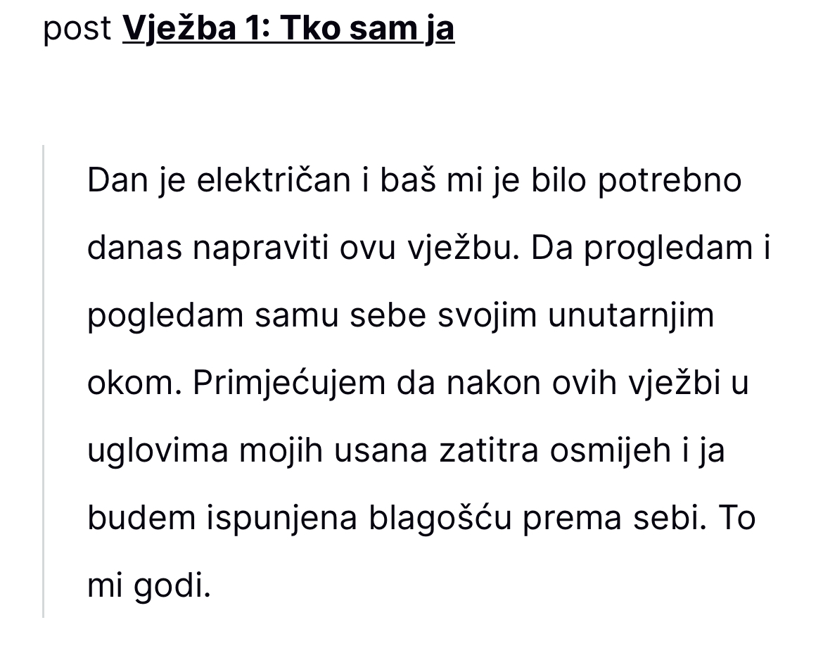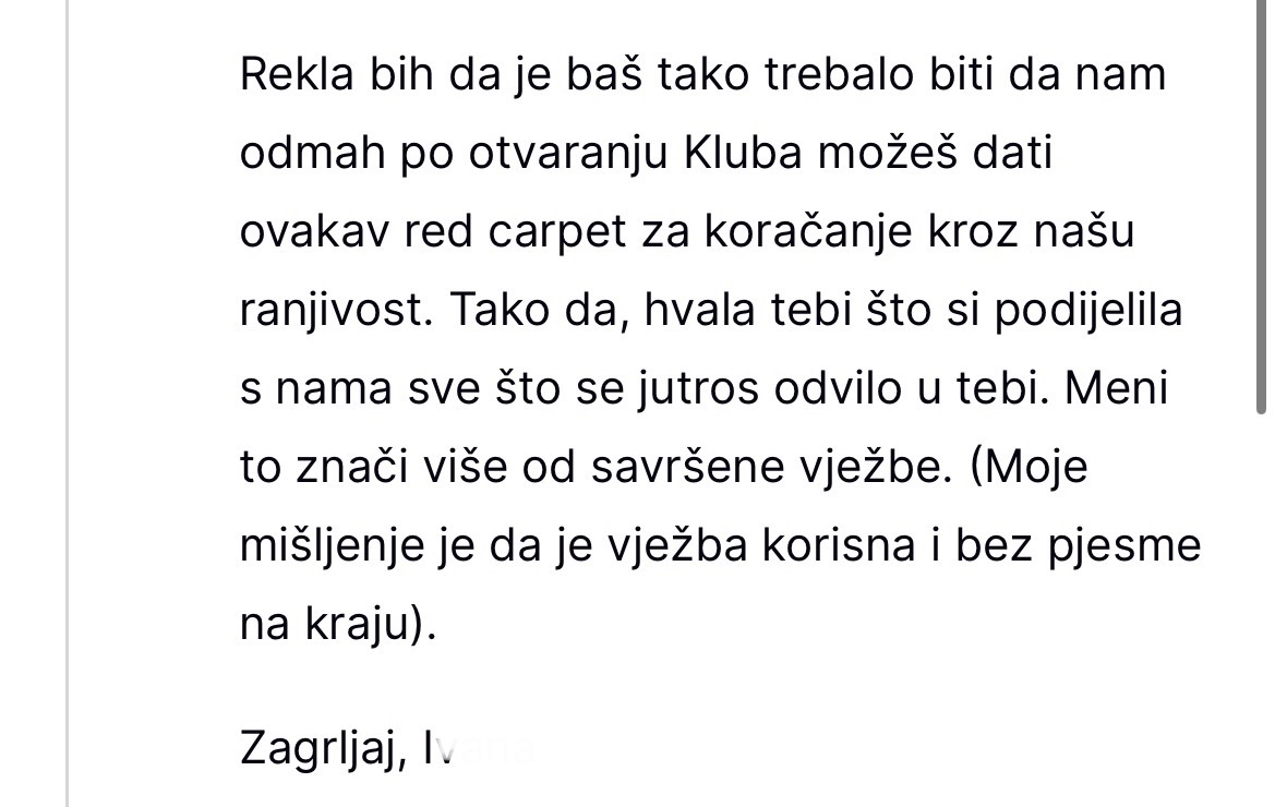 Volim tvoje pisane vježbe. Uče me samu sebe definirati, tražiti adekvatne riječi za ono što o sebi znam/slutim/mogu! Već dugo te pratim i samo želim reći da si jedinstvena i jedva čekam jesen i Klub!