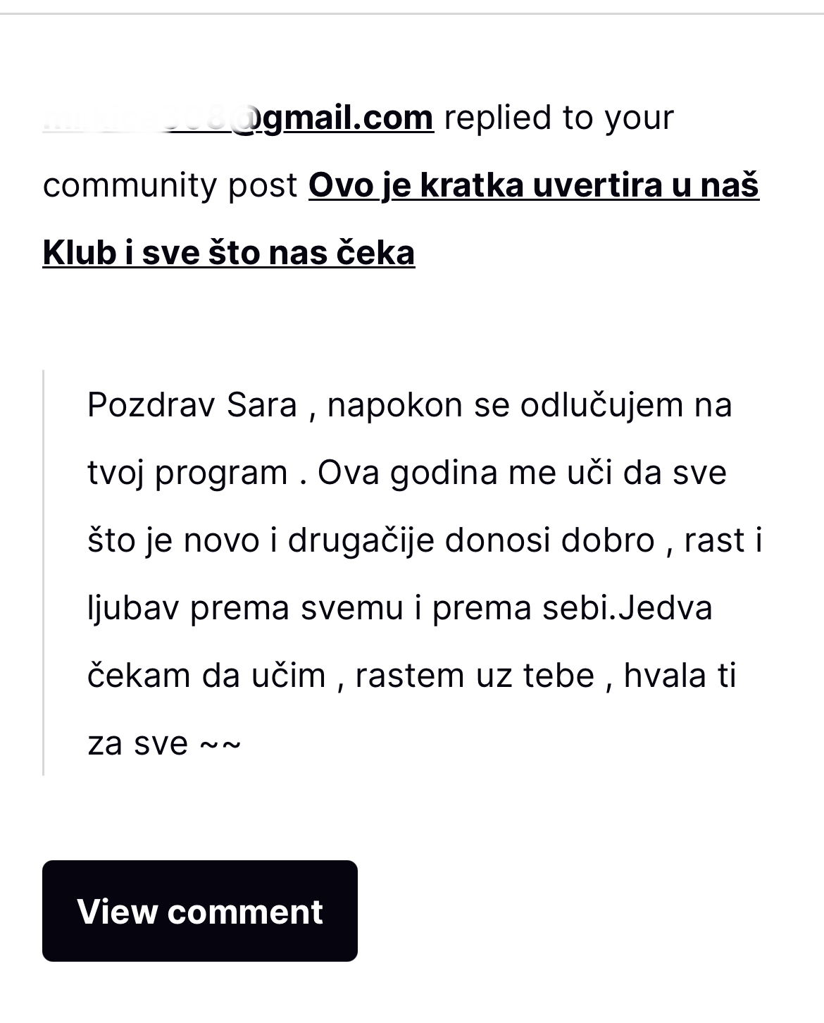 Nećemo se lagati; sve ponekad nemamo vremena, posustanemo, mislimo da ne možemo promijeniti navike, da je teško i da ne možemo izvršiti neki zadatak koji će biti na platformi. Ono što sam osobno naučila, a i u radu s klijentima - PODRŠKA JE KLJUČNA. Sve možemo same, kroz knjige ili praćenje edukacija, no ljudsku podršku, utjehu i razumijevanje nitko ne može nadomjestiti. Tu smo za pitanja, komentare, podršku i poguranac!