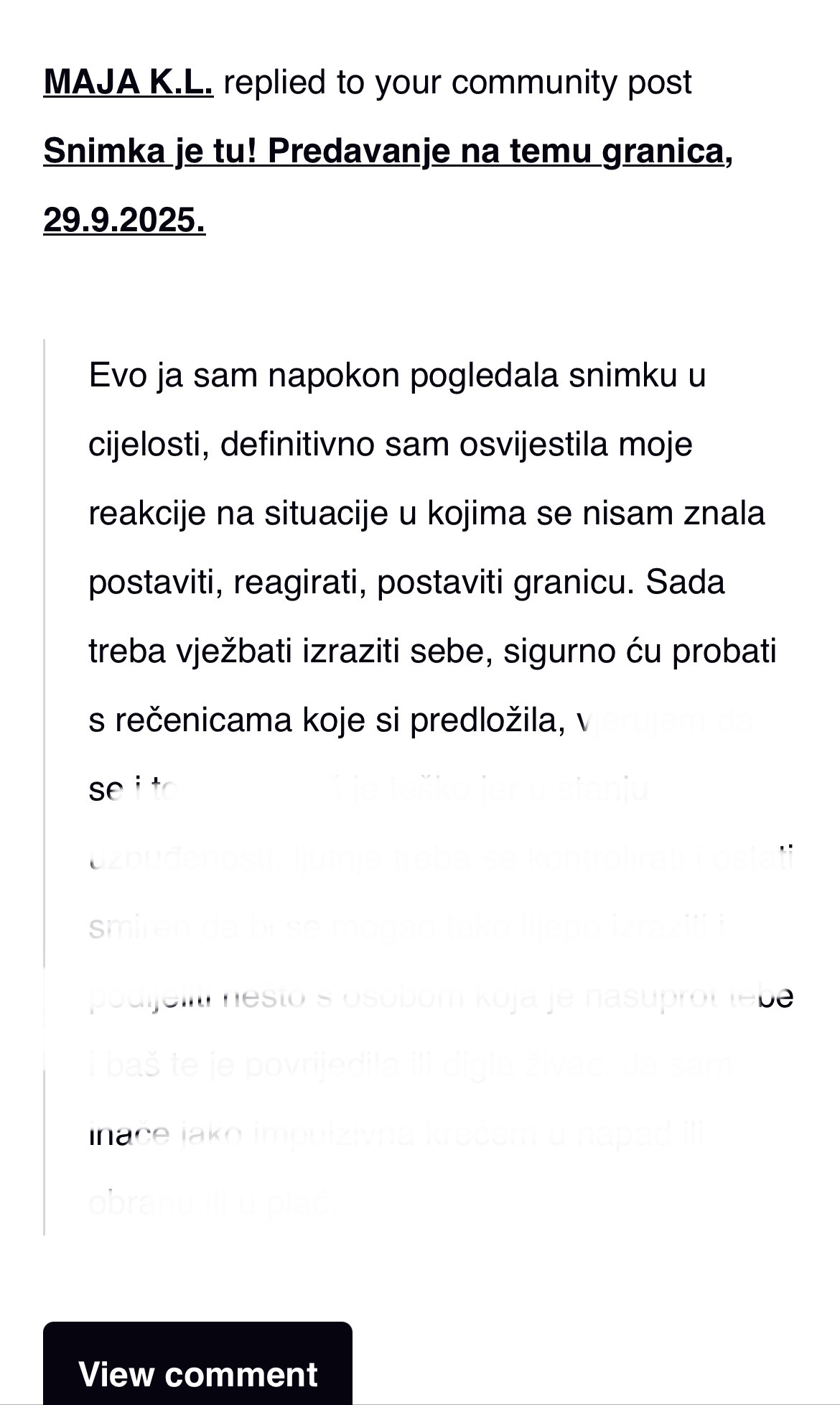 Nisi ugodna s online radom. Možeš odabrati jednomjesečnu opciju pa isprobati. Razumijem da je online nepoznat ako nikada nisi prisustvovala ovakvom obliku rada, no donosi mnogo benefita: povezivanje s ljudima, praćenje sadržaja kad god si u prilici (zato su tu snimke ako ne stigneš), lakoća pristupu, sve na jednom mjestu...