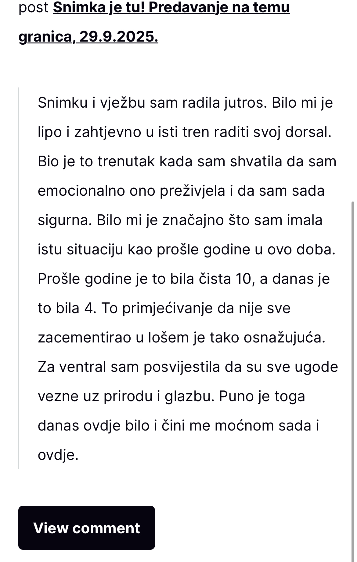 Ako želiš poraditi na svakodnevici, boljem razumijevanju sebe, otpuštanju briga i strahova od nepoznatog i promjene; ako želiš moja predavanja, vježbe i poticaje za promišljanje daleko od društvenih mreža, u sigurnoj zajednici te live druženja, ovo je mjesto za tebe. Uz tebe sam kontinuirano, pratim tvoje putovanje, i nudim ti dugoročne resurse.